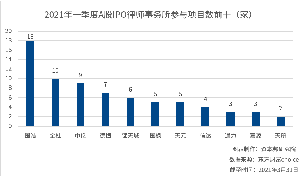 从一季度IPO法律顾问业绩来看,国浩最为突出,共为18家企业IPO上市担任法律顾问。其次是金杜,为10家,排名第三的是中伦,为9家。