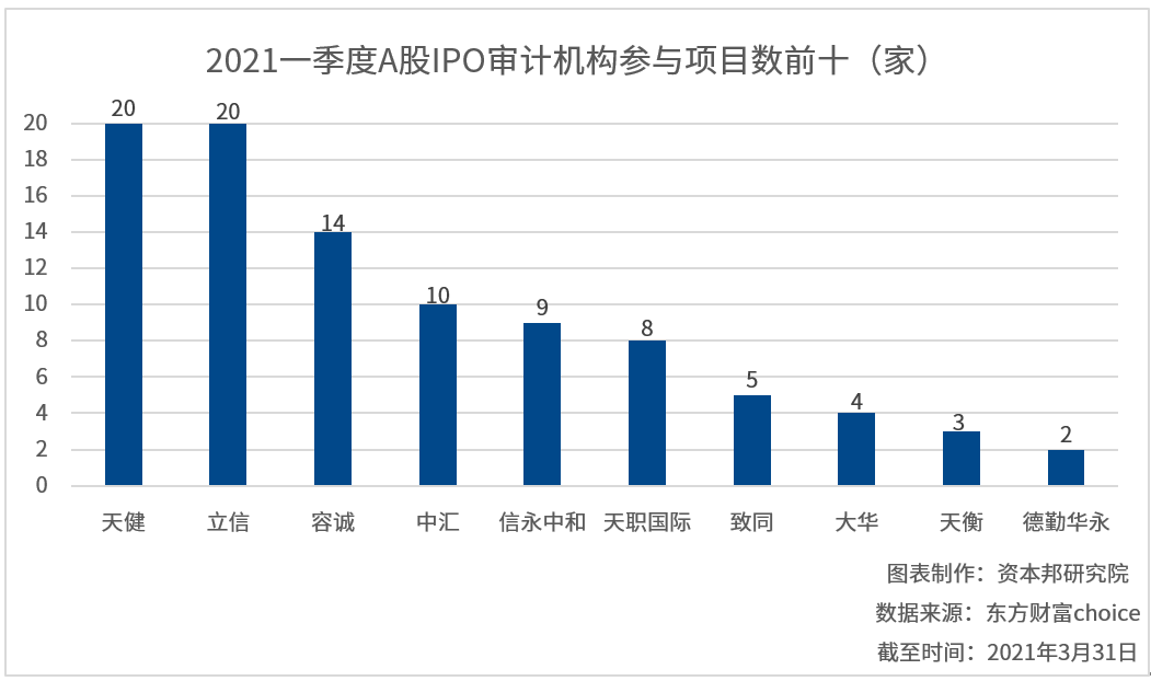 从审计机构来看,今年一季度天健和立信并列第一,均为20家企业IPO上市担任审计验资服务。其次是容诚,为14家,还有中汇是10家。