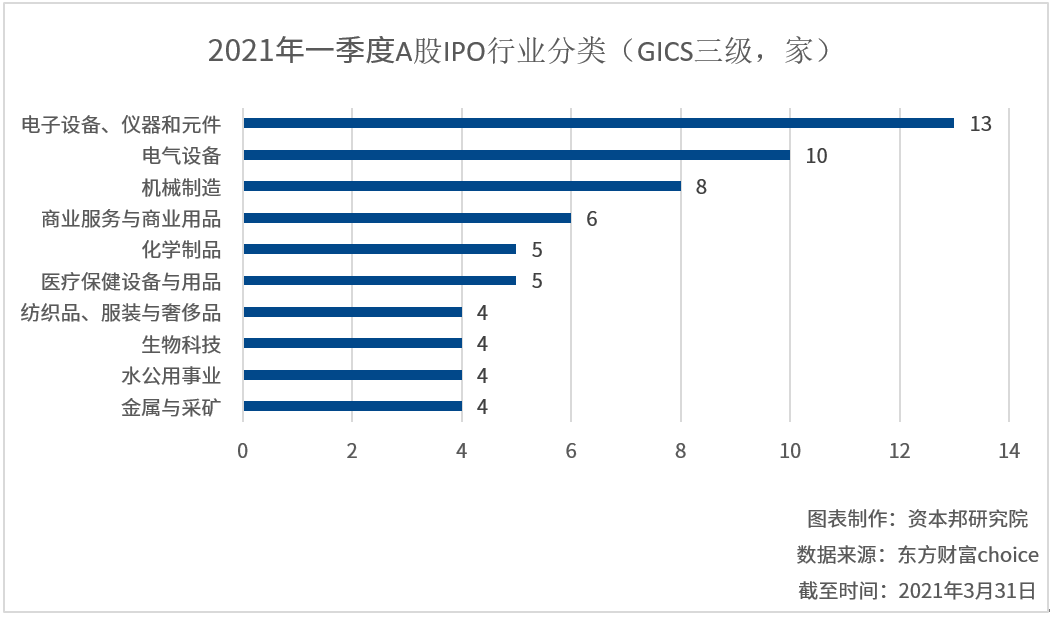 从具体行业来看,以GICS行业三级分类,电子设备、仪器和原件行业共有13家企业在A股上市,其次是电气设备,共有10家,排名第三的是机械制造,为8家。
