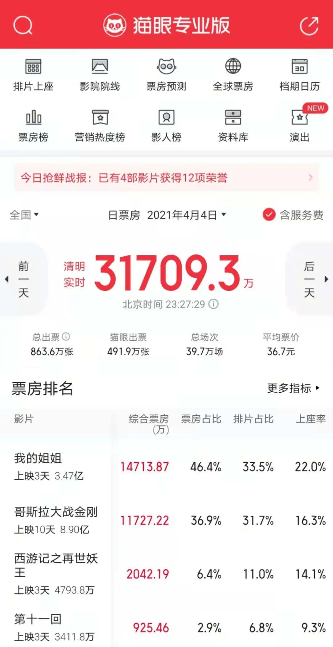 截至发稿,4月4日单日票房前三影片为:《我的姐姐》1.47亿(累计3.47亿)、《哥斯拉大战金刚》1.17亿(累计8.90亿)、《西游记之再世妖王》2042万(累计4797万 )。