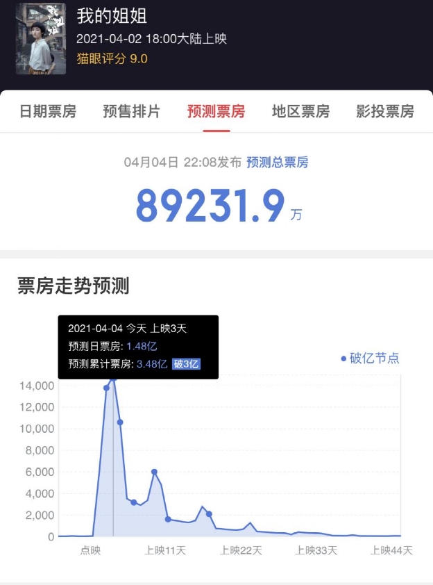 截至发稿,据猫眼专业版预测显示,《我的姐姐》票房有望接近9亿大关。