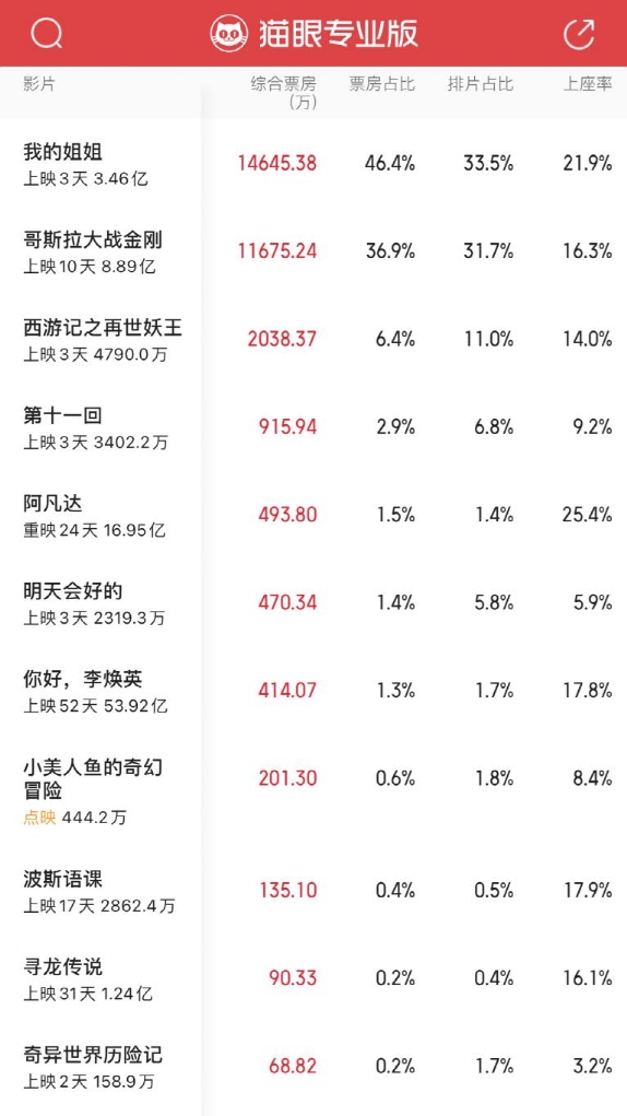 从整体影片表现来看,目前《我的姐姐》稳居第一,《哥斯拉大战金刚》位于第二,《西游记之再世妖王》从上映首日排片占比第五升至第三,《第十一回》则从上映首日排片占比第三降至第四,重映片《阿凡达》目前位列单日排片第五,排片和票房均远超《金刚川》、《百团大战》等影片。