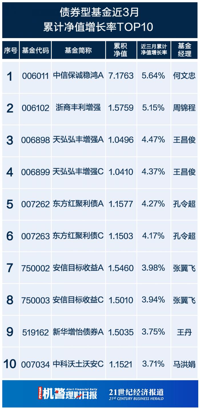 今日债券型基金榜单中,从近3月累计净值增长率来看,增长率最高的前10位产品包括中信保诚稳鸿A、浙商丰利增强债券、东方红聚利债券A等。其中,中信保诚稳鸿A的累计净值最高,为7.1763;持仓方面,其债券仓位达76.19%,持仓占比前三的债券分别为20进出04、20国开16、20进出09。