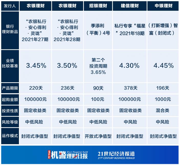 据南财理财通数据显示,今日银行理财新品以固定收益类为主,交银理财、中银理财、渤海银行、广州农商行、广东华兴银行等有发售混合类产品。