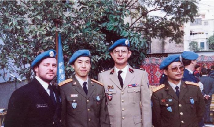 1990年4月,中国首次向联合国停战监督组织派出的军事观察员,庞延东少校(左二)、徐进先少校(右一)