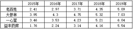 根据公司公告显示,老百姓、大参林、一心堂和益丰药房2019年的坪效分别为60元、86元、44.3元和59.4元。不过,到了2020年上半年,益丰药房的日均单店坪效达到66.4元/平方米,超过了老百姓(61元/平方米),体现出公司精细化管理的水平。