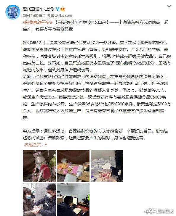 浦东警方捣毁生产窝点3处、销售窝点24处,现场查获有毒有害减肥类保健食品65000余粒、生产原料约34公斤、生产设备3台以及外包装20000余件,涉案金额达5000万余元。现涉案嫌疑人因涉嫌生产、销售有毒有害食品罪被依法采取强制措施。