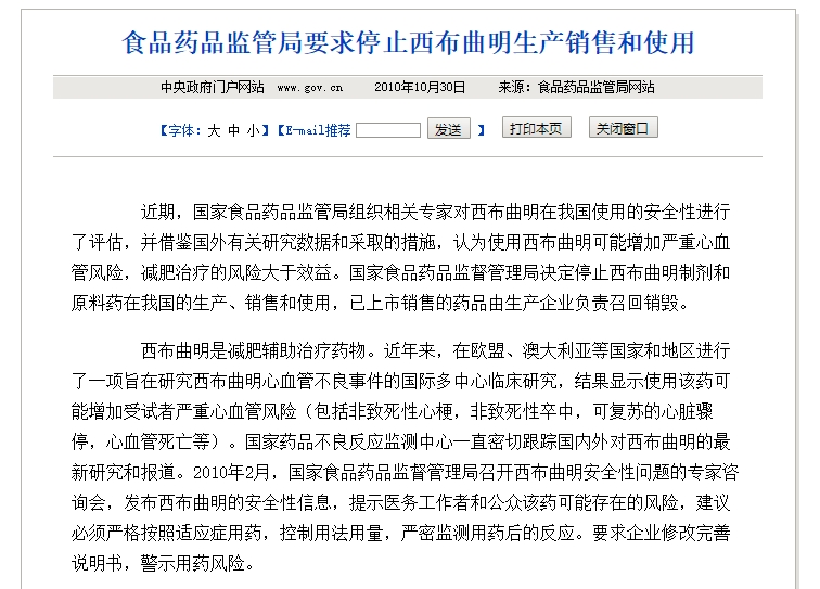 早在2010年2月26日,原国家食药监局对于西布曲明进行安全信息及风险提示,2010年10月30日正式发布通知,要求停止生产销售西布曲明制剂及原料药。