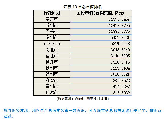 截至4月2日收盘,江苏各城市上市公司A股市值(含限售股)如下: