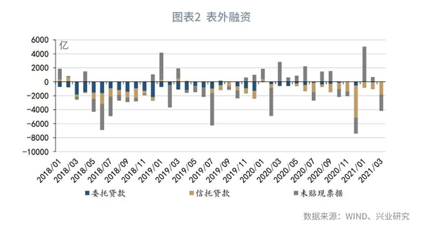 为什么3月社融偏弱,而贷款偏强?第一,3月表外融资压缩力度加大。3月信托贷款与未贴现票据分别减少1791亿和2297亿,同比分别多减了1770亿和5115亿。这表明在经济稳中向好的背景下,政策当局开始加大对表外融资的压降力度。