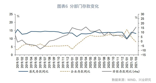 从非银存款来看,2020年3月海内外金融市场受疫情影响较大,导致非银存款增长放缓。因此,去年同期基数偏低是2021年3月非银存款高增的重要原因。