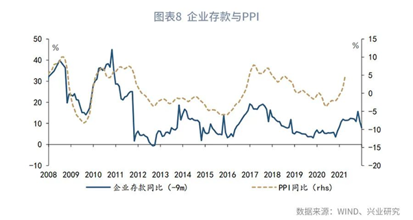 从分部门的存款变化来看,当前的融资格局对企业存款的影响最为明显。3月企业存款增速显著回落,企业存款增速正在逐渐向疫情前的水平回归。企业存款同比领先PPI同比 9个月左右。这意味着企业存款增速下降对PPI的影响可能要到2021年末或2022年初才会显现出来。