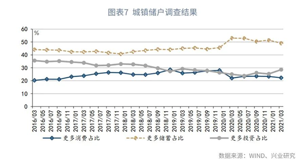 从居民存款来看,居民存款增速下降与居民储蓄意愿下降有关。第一季度城镇储户中选择更多储蓄的比例为49.1%,较上个季度下降了2.3个百分点。而且,虽然居民存款的增速有所回落,但其绝对水平依然较高。