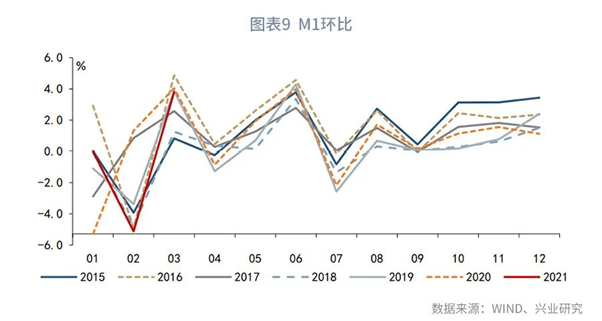 此外,从M1来看,2020年疫情爆发初期,企业和居民出于预防性需求选择持有更多流动性好的资产,如活期存款,导致2020年3月M1环比较高。这也使得2021年3月M1同比较2月进一步回落。不过,虽然2021年3月M1同比的绝对水平较低,但从M1环比来看,M1增长并不疲弱。
