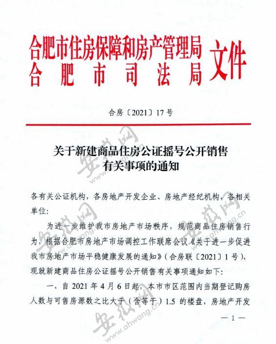 通知要求,合肥市各有关公证机构,各房地产开发企业、房地产经纪机构,各相关单位要注意,自2021年4月6日起,合肥本市市区范围内当期登记购房人数与可售房源数之比大于(含等于)1.5的楼盘,房地产开发企业应采取委托公证机构公证摇号方式公开销售。公证摇号选房应使用公证机构提供的电脑摇号软件,因公证产生的费用由房地产开发企业承担。