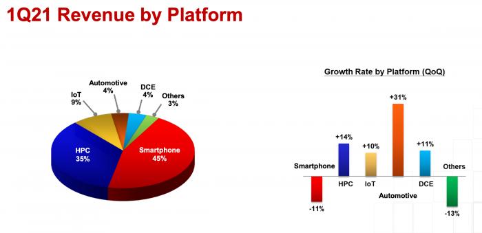 其中,智能手机、高性能计算市场(HPC)分别为台积电贡献了45%、35%的收入,合计高达80%。但是,智能手机一季度营收占比环比下降11%,HPC增长13%。同时,汽车大幅增长32%,不过占比仍比较小,为4%;此外,DCE增长10%,占比4%,物联网增长10%,占比9%。
