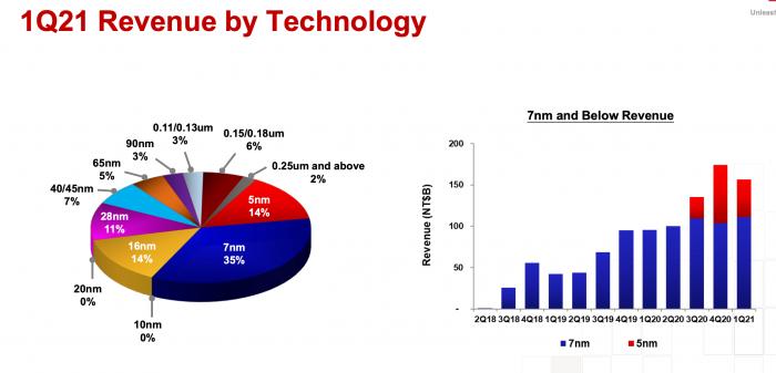 从制程分类看,5nm营收占比14%,7nm占比35%,占比合计达49%,先进制程进一步提高。同时在业绩会上,台积电总裁魏哲家表示,N5(5纳米)已经进入第二年的量产中,良率比最初计划要好。由于智能手机和HPC应用的推动,需求持续强劲,预计5纳米在2021年的晶圆收入中贡献将达约20%。N3(3纳米)技术发展良好,产品计划今年投入试生产,2022年实现量产。