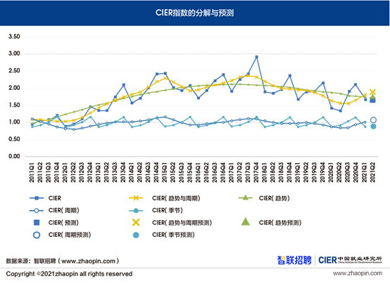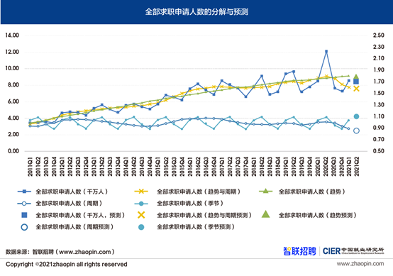 基于计量模型的预测显示,2021年二季度的全部求职申请人数(周期成分)低于一季度,全部求职申请人数(趋势成分)与一季度基本持平,而全部求职申请人数(季度因素)将略高于2020年一季度。综合来看,2021年二季度全部求职申请人数将略低于一季度,且低于去年同期水平。