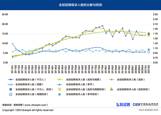 基于计量模型的预测显示,2021年二季度的全部招聘需求人数(周期成分)将与一季度基本持平,全部招聘需求人数(趋势成分)将略低于一季度,而全部招聘需求人数(季度因素)则会明显高于一季度。综合来看,2021年二季度全部招聘需求人数将略高于一季度,但低于去年同期水平。