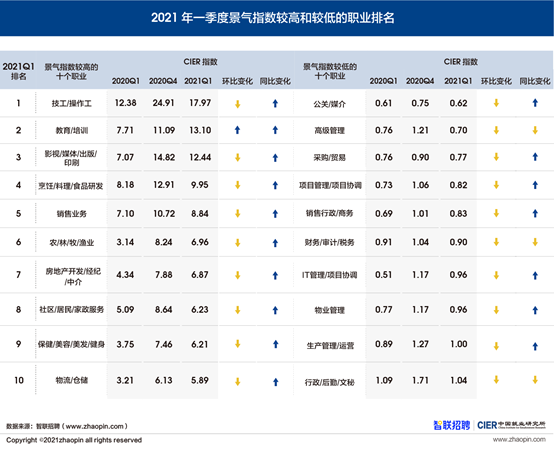 由表2可见,2021年一季度就业市场景气指数较高的职业仍为技工/操作工、教育/培训、影视/媒体/出版/印刷、烹饪/料理/食品研发和销售业务等。本季度技工/操作工的排名仍处于首位,CIER指数为17.97。环比来看,受求职申请人数季节性上升的影响,多数景气指数较高的职业CIER指数下降。而教育/培训职业的CIER指数逆势上升,招聘需求人数环比增加35.13%,大于求职申请人数增幅,CIER指数较上季度上升了2.01。与去年同期相比,上述职业的招聘需求人数均增加,特别是技工/操作工、教育/培训、影视/媒体/出版/印刷和物流/仓储等职业增幅相对较大,而求职申请人数或增幅较小或下降,CIER指数同比回升明显。