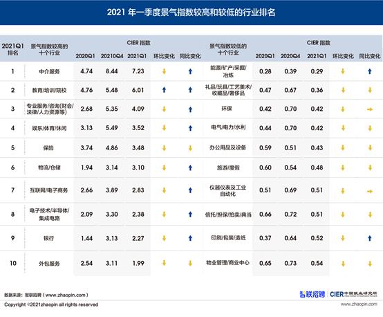 2021年一季度招聘需求人数增幅小于求职申请人数,CIER指数环比季节性下降。同比变化方面,国内疫情形势基本稳定,经济逐步复苏的影响下,本季招聘需求人数增幅大于求职申请人数,CIER指数高于去年同期水平。