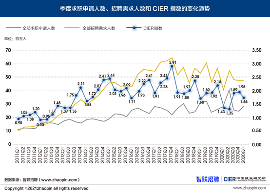 中国人民大学中国就业研究所与中国领先的职业发展平台智联招聘联合推出CIER(中国就业市场景气指数),反映我国就业市场的整体走势及景气程度。该指标采用智联招聘(zhaopin.com)全站数据分析而得,通过不同行业和职业、不同地区和城市、不同企业类型等供需指标的动态变化,来反映就业市场上职位空缺与求职人数的比例变化,进而起到监测中国就业市场景气程度变化的作用。