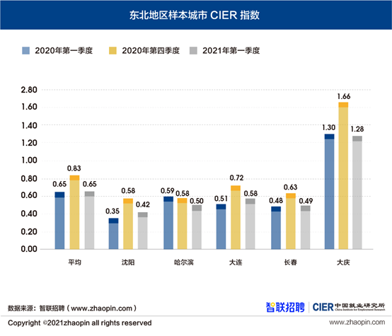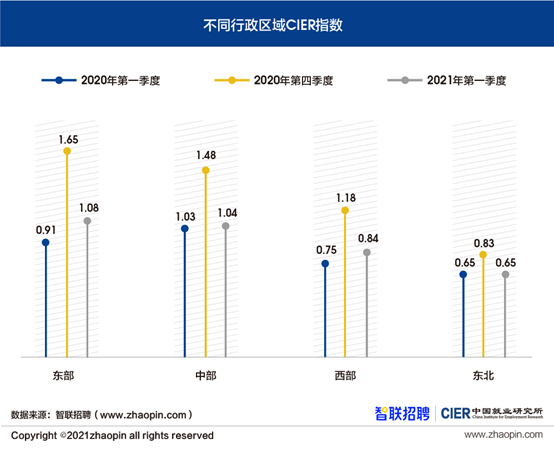 图5结果显示,2021年一季度东部、中部、西部和东北地区CIER指数呈现依次递减趋势。具体而言,东部地区CIER指数最高,为1.08,就业市场相对宽松;中部地区次之,CIER指数分别为1.04;西部地区CIER指数为0.84;东北地区CIER指数为0.65,就业竞争较为激烈。