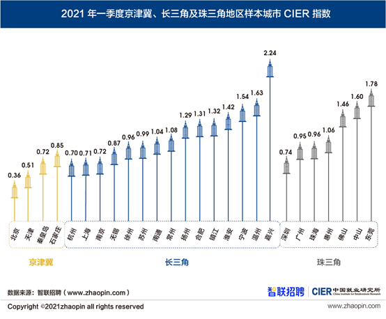 图7 2021年一季度京津冀、长三角及珠三角地区样本城市CIER指数