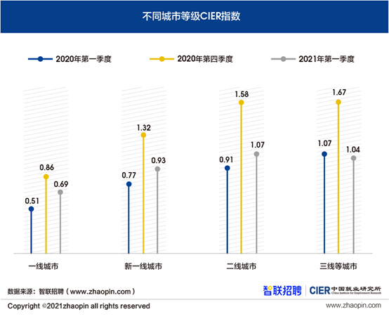图9中结果显示,2021年一季度二线城市CIER指数最高,为1.07,就业市场相对宽松;三线等城市次之,CIER指数为1.04;一线和新一线城市CIER指数较低,分别为0.69和0.93,就业市场仍相对紧张。与上季度相比,上述城市的求职申请人数均有大幅增加,CIER指数下降明显。与去年同期相比,一线城市招聘需求人数增加8.95%,而求职申请人数减少17.74%,CIER指数同比上升了0.18,就业竞争略有缓解;新一线和二线城市招聘需求人数增幅相对较大,分别增加24.40%和15.11%,求职申请人数变动幅度较小,CIER指数同比也上升;三线等城市招聘需求人数和求职申请人数分别增加9.23%和9.20%,变动幅度较为接近,CIER指数同比略有下降。