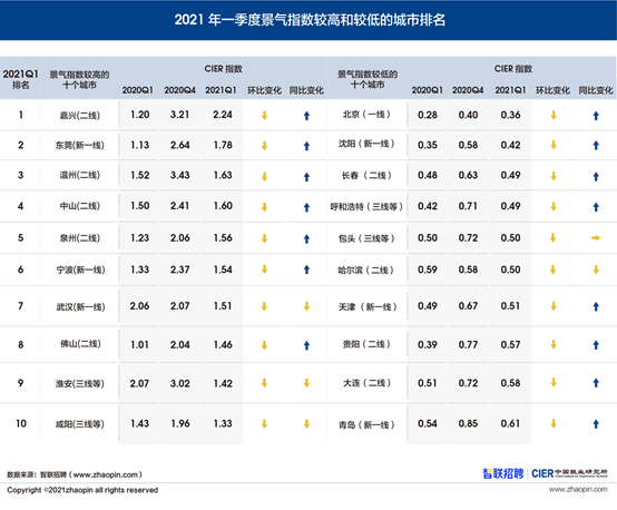 从表3中可以看出,2021年一季度CIER指数较高的城市主要仍是长三角、珠三角和东部沿海地区的二三线城市,如嘉兴、温州、中山、泉州、佛山等。新一线城市中东莞、宁波和武汉的CIER指数也相对较高。与上一季度相比,上述城市的求职申请人数均有大幅上涨,CIER指数季节性下降。与去年同期相比,嘉兴、东莞、泉州和佛山等城市的招聘需求人数增幅较大,而求职申请人数下降,CIER指数同比上升明显。武汉的就业市场活力较2020年一季度回升明显,招聘需求人数增加36.33%,但由于求职申请人数增幅相对更大,为86.22%,CIER指数同比下降了0.55。中山、宁波、淮安和咸阳的招聘需求人数则同比下降,特别是淮安的降幅为28.27%,但中山和宁波受求职申请人数也大幅减少的影响,CIER指数同比上升,而淮安和咸阳的求职申请人数增加,CIER指数同比下降。