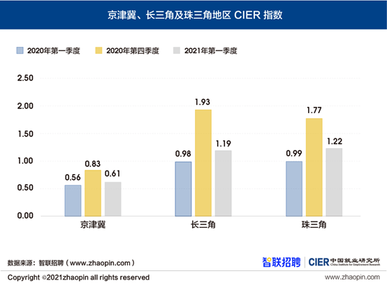 本季度长三角和珠三角地区景气指数仍相对较高,CIER指数分别为1.19和1.22。环比来看,受求职申请人数增加的影响,本季度上述地区城市的CIER指数均呈现季节性下降。同比来看,长三角地区招聘需求人数增加8.83%,特别是无锡、常州、扬州、镇江和嘉兴等城市,招聘需求人数增幅在20%以上;而求职者端的投递减少17.30%,如杭州、上海、宁波等城市,求职申请人数降幅在20%左右。在供求两端共同作用下,长三角地区CIER指数较2020年一季度上升了0.21。珠三角地区CIER指数同比也回升。在广州、佛山和东莞等城市需求带动下,珠三角地区招聘需求人数同比增加14.65%,求职申请人数则减少14.85%,CIER指数上升了0.23。
