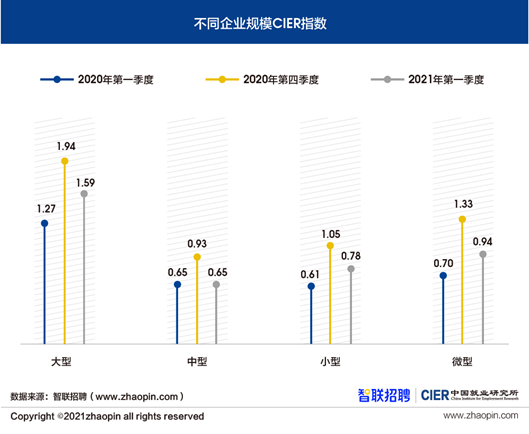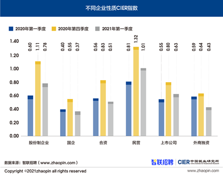 与上季度相比,民营和上市公司的招聘需求人数增加,但增幅小于求职申请人数,CIER指数环比下降;股份制企业、合资、国企和外商独资企业的招聘需求则下降,同时求职申请人数增加,CIER指数环比也下降。与2020年一季度相比,各类性质企业CIER 指数变化存在差异。其中,民营企业和上市公司的招聘需求人数上升明显,增幅较分别为25.43%和15.02%,而求职申请人数略有增加,CIER指数同比上升;股份制企业招聘需求人数增加10.36%,求职申请人数减少14.77%,CIER指数同比也上升;国企、合资企业和外商独资企业招聘需求人数则分别减少12.99%、23.01%和38.23%,且大于求职申请人数降幅,CIER指数同比则下降。