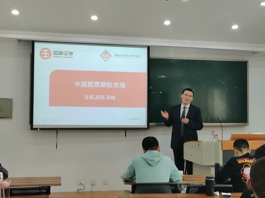 课程中,孙老师从期权市场发展、基本交易制度期权、交易界面以及期权交易策略体系四方面开展此次授课,为同学们普及证券期货等方面的金融知识,并从实际出发将晦涩难懂的期权知识简单化、生活化,让同学们清晰明了的理解相关知识。此次授课既帮助学生逐步理解期货市场运行方式和品种特点,又让其深度的接触期权知识,让学生对期货行业有了新的理解和认识。