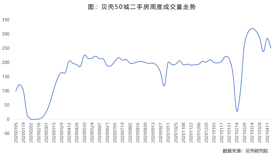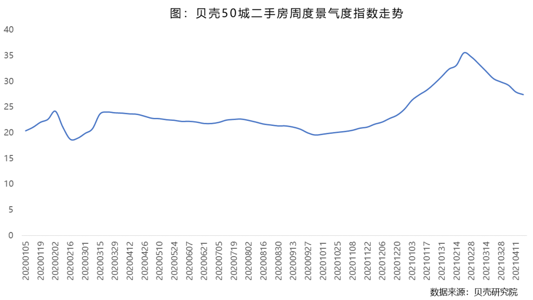 房贷利率提高,促使市场成交高位调整。贝壳研究院数据显示,4月以来(截至4月18日),贝壳50城二手房成交量高位震荡调整,4月日均成交较3月日均水平下降约14%。业主预期保持调整,贝壳50城二手房市场景气度指数回落至27,市场整体处于平稳区间。