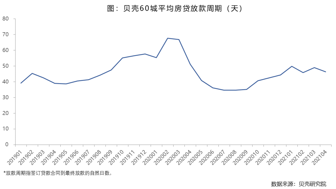 房贷利率与LPR之间的背离继续扩大。4月,贝壳研究院监测的60城主流首套房贷利率为5.38%,较3月增加4个基点;二套利率为5.65%,较3月增加3个基点。自2020年11月房贷利率止降回升,至今首套、二套利率分别累计上升17个、13个基点。4月60城房贷平均放款周期为46天,呈高位调整态势。