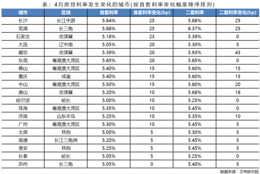 房贷加息的城市覆盖南北各区域,京津冀城市群明显提高。4月60个重点城市中,18个城市首套房贷利率上浮,14个城市二套利率均上升,重合的13个城市首套、二套利率均上浮,覆盖城市群包含长三角、珠三角、京津冀、山东半岛及东北区域等,本月无城市下调房贷利率。京津冀城市群首套、二套利率提高幅度均超过10个基点,在各区域中最显著;其中廊坊首二套利率提高43个基点,在60个重点城市中排名第一,首套利率提高20个基点,幅度也在60城中前列。广州、东莞、佛山等城市及长沙、芜湖、南通等长三角城市房贷利率提高,其中长沙、芜湖首套、二套房贷利率均提高25个基点。山东半岛城市如济南、东北区域城市如大连、哈尔滨等城市房贷利率也不同程度的上浮。