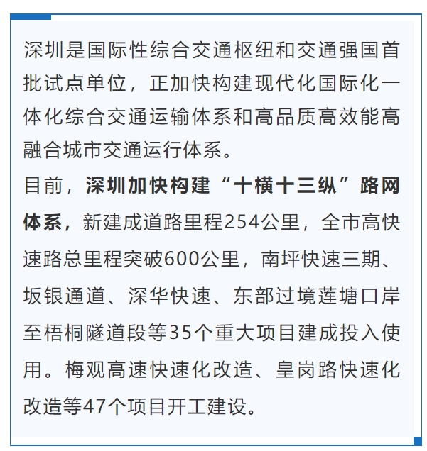 “深圳正在努力建设国际性综合交通枢纽,构建现代化国际化一体化综合交通运输体系和高品质高效能高融合城市交通运行体系,为深圳加快现代化国际化创新型城市建设更好地发挥支撑带动作用。”深圳市交通局有关负责人说。