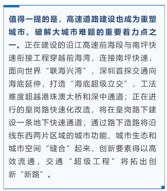 打造科技和产业创新高地,深圳加快构建支撑创新要素集聚的路网体系,一方面构建功能清晰、结构合理的多元跨江通道体系,包括加快推进深中通道建成通车等,促进珠江东西两岸资源要素便捷流通;另一方面,加快打通深圳与东向沿海节点联系瓶颈,包括深惠高速、深汕高速扩容,建设深圳外环高速公路,推进深汕第二高速工程等,助力大湾区沿海轴带对外辐射能级提升;同时,加强深莞惠边界道路对接,促进都市圈路网一体化发展。