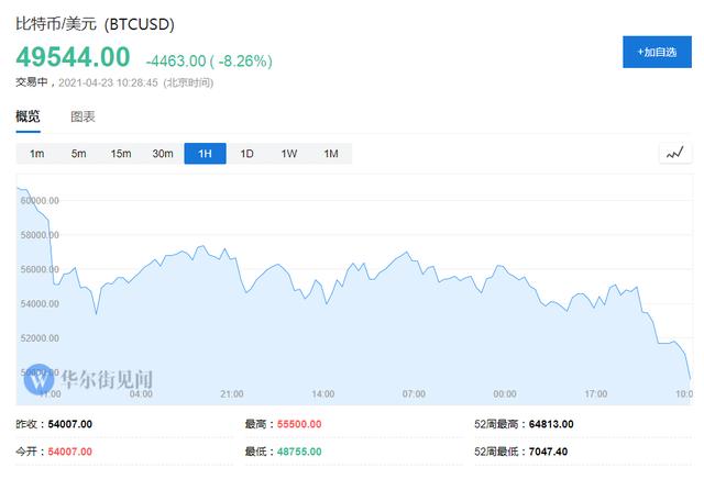 4月21日再度大跌超4%,币价跌破54000美元关口。
