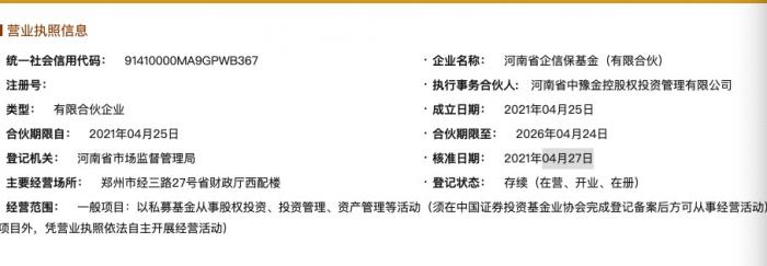 工商登记信息显示,河南省企信保基金(有限合伙)经营范围为以私募基金从事股权投资、投资管理、资产管理等活动,主要经营场所为郑州市经三路27号省财政厅西配楼。