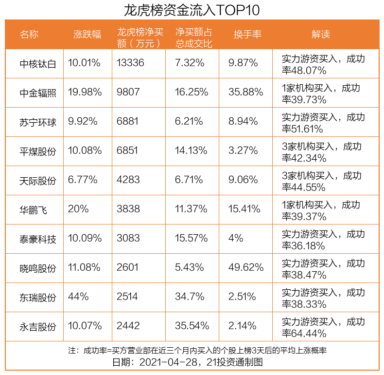 4月28日,上证指数上涨0.42%,深证成指上涨0.94%,创业板指上涨2.16%。盘后龙虎榜数据显示,共有54只个股因当日异动登上龙虎榜,资金净流入最多的是中核钛白(002145.SZ),达1.33亿元。