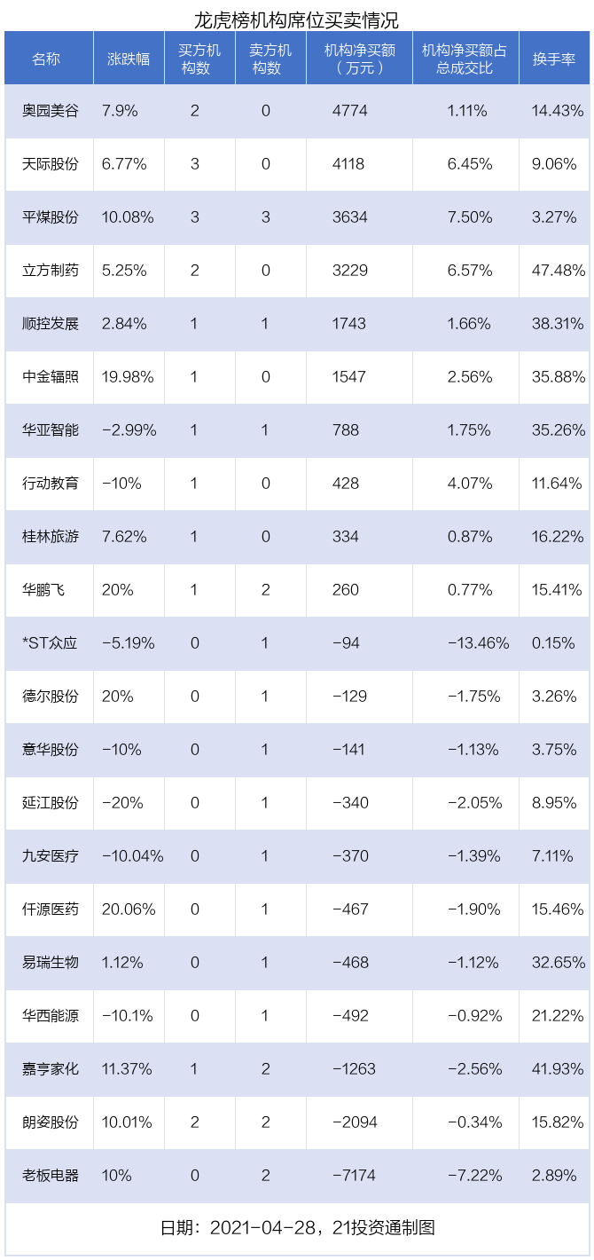 4月28日,21只个股龙虎榜出现了机构的身影,机构合计净买入7821.23万元。具体来看,机构净买入10股,净卖出11股。