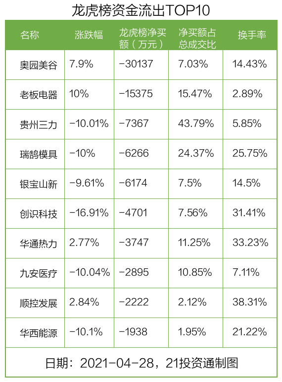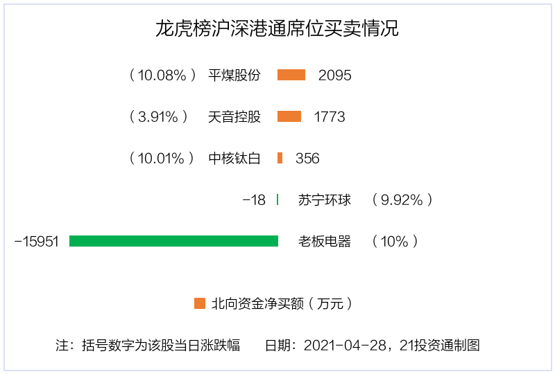 值得注意的是,机构和北向资金共同净买入了平煤股份;共同净卖出了老板电器。值得注意的是,老板电器午后涨停,4月28日披露一季报,公司2021年一季度实现营业总收入19.1亿,同比增长50.8%;实现归母净利润3.6亿,同比增长46.5%。