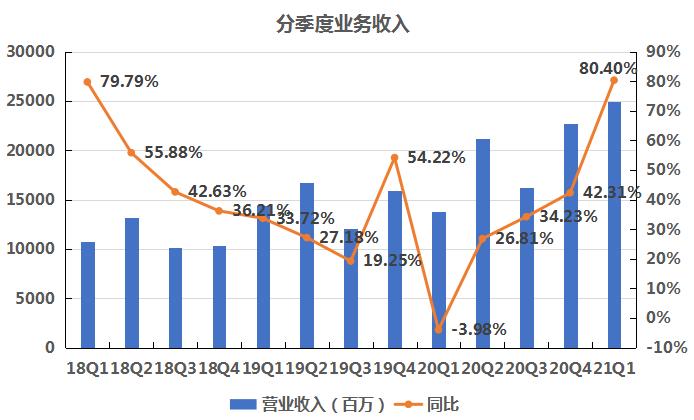 归因分析可以发现。公司的毛利率比2020年一季度低了1.73个百分点。但是同期费用率下降了2.79个百分点,两相抵消后,为公司的扣非净利润率净贡献了约1.06个百分点。说明公司2021年一季度利润高增有约46%的原因出在毛利率和费用率的变化上。