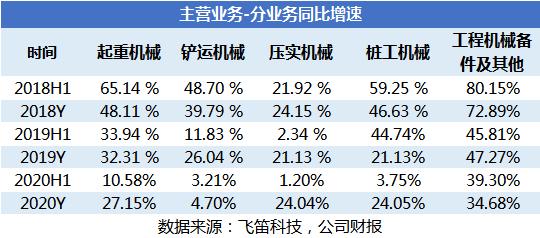 上图是公司分业务的表现,2020年上市公司的主要业务收入中,起重机械占约35%,工程机械备件及其他业务约占25%。铲运机械和桩工机械分别占约10%,压实机械占约3%。