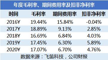 上表是公司2016年以来的毛利率,销售、管理和销售三项期间费用的费用率以及扣非口径的净利润率。从上表可以看到,2020年,公司扣费净利率下降了1.13个百分点。