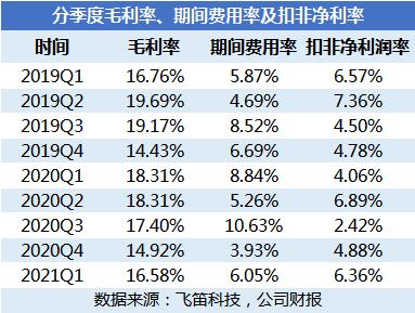 上表是2019年以来九个季度的毛利率、期间费用率和扣费净利率,从上表可以看到,公司2021年一季度,公司扣非净利率比2020年同期增加了2.3个百分点。
