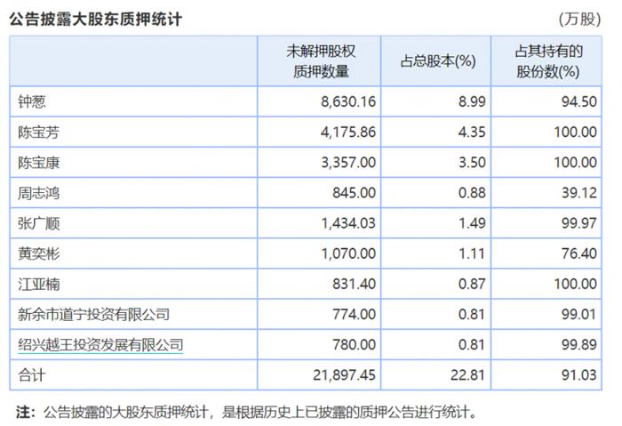 尤其是公司实控人钟葱直接持有的公司股份1.08亿股(占公司总股本的12.89%),93.24%处于质押状态,其中54.52%触及平仓线面临被强制平仓风险。