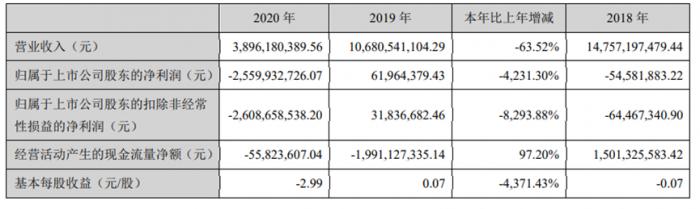 报告期,公司营收38.96亿元,同比下降63.52%,净利润巨额亏损26.67亿元, 2019年同期为盈利4135.78万元,同比大降6547.70%。