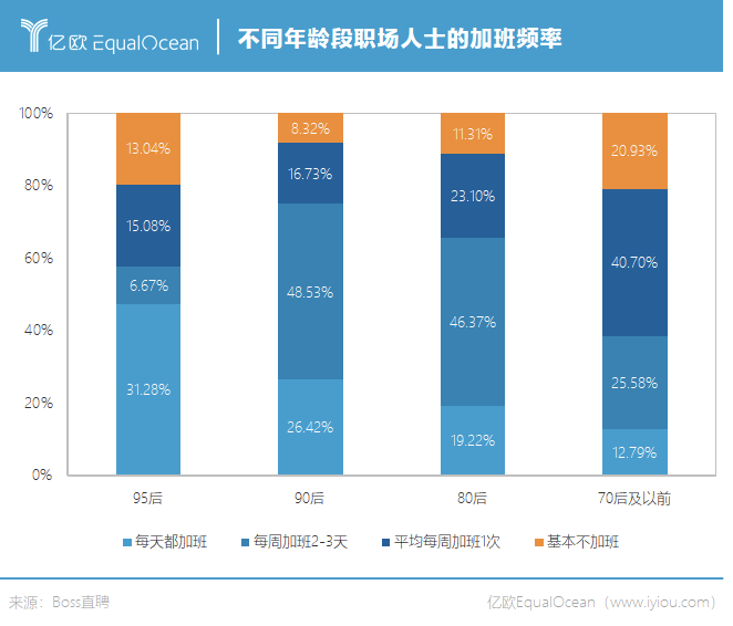 此外,“每天都加班”的情况在年龄越小的群体中比例越高。95后位居“每天都加班”的人群之首,而90后在“基本不加班”人群中垫底。